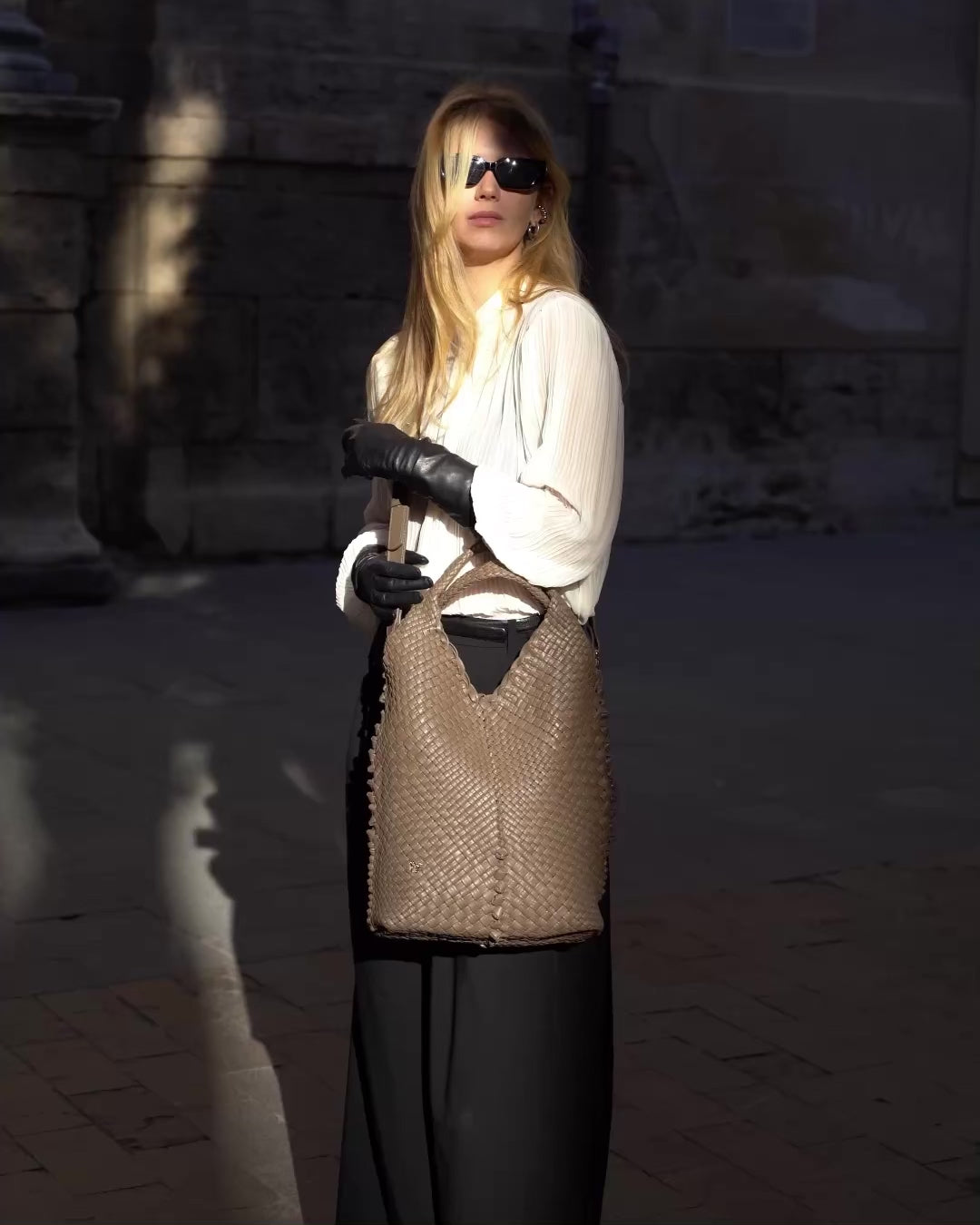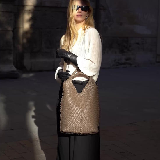 A handwoven shopper in a new variation. The leather strips are woven in a way that highlights the unique geometric shape. The height of this model ensures incredible spaciousness and keeps your belongings secure.